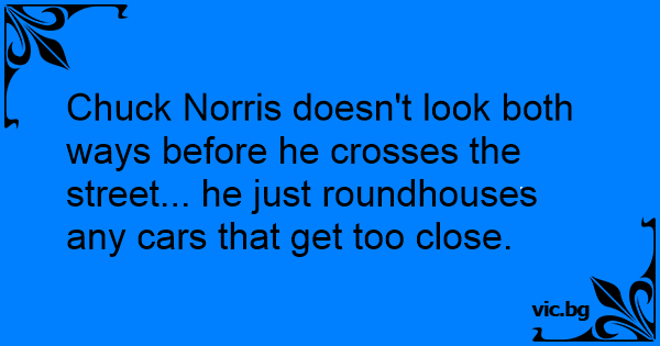 Chuck Norris doesn't look both ways before he crosses the street... he just roundhouses any cars that get too close.