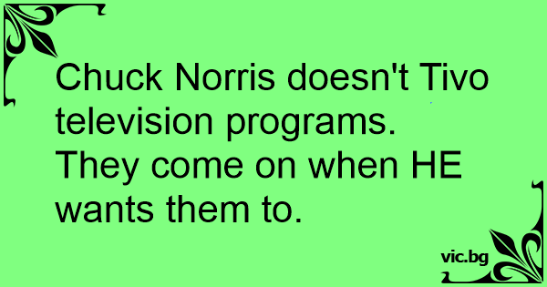 Chuck Norris doesn't Tivo television programs.They come on when HE wants them to. 27 0 0 Chuck Norris Jokes