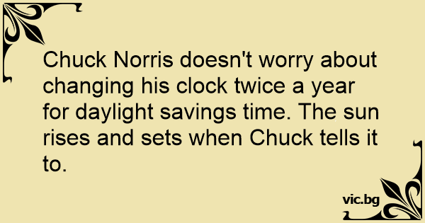 Chuck Norris doesn't worry about changing his clock twice a year for daylight savings time. The sun rises and sets when Chuck tells it to.