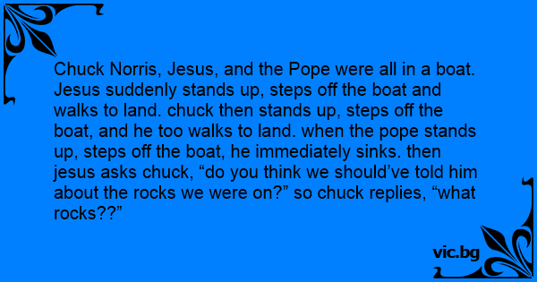 Chuck Norris, Jesus, and the Pope were all in a boat. Jesus suddenly stands up, steps off the boat and walks to land. chuck then stands up, steps off the boat, and he too walks to land. when the pope stands up, steps off the boat, he immediately sinks. then jesus asks chuck, “do you think we should’ve told him about the rocks we were on?” so chuck replies, “what rocks??”