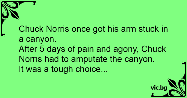 Chuck Norris once got his arm stuck in a canyon. After 5 days of pain and agony, Chuck Norris had to amputate the canyon. It was a tough choice...