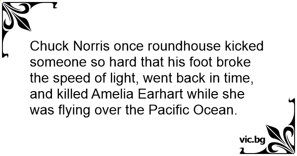 Chuck Norris once roundhouse kicked someone so hard that his foot broke the speed of light, went back in time, and killed Amelia Earhart while she was flying over the Pacific Ocean.