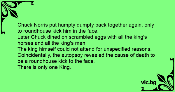 Chuck Norris put humpty dumpty back together again, only to roundhouse kick him in the face.