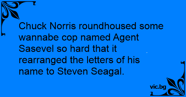 Chuck Norris roundhoused some wannabe cop named Agent Sasevel so hard that it rearranged the letters of his name to Steven Seagal.