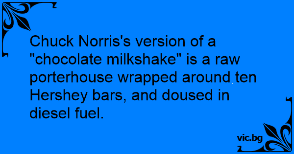 Chuck Norris's version of a "chocolate milkshake" is a raw porterhouse wrapped around ten Hershey bars, and doused in diesel fuel.
