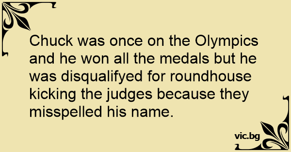Chuck was once on the Olympics and he won all the medals but he was disqualifyed for roundhouse kicking the judges because they misspelled his name.