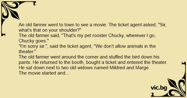 The old farmer went around the corner and stuffed the bird down his pants. He returned to the booth, bought a ticket and entered the theater. He sat down next to two old widows named Mildred and Marge.