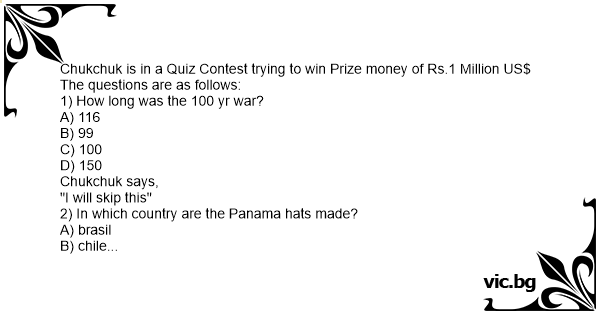 Chukchuk is in a Quiz Contest trying to win Prize money of Rs.1 Million US$