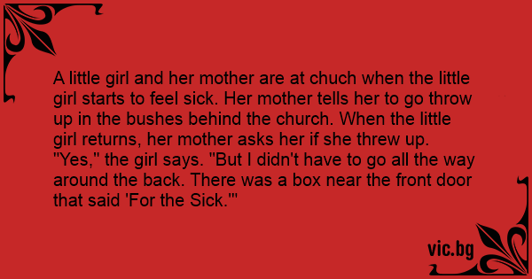 A little girl and her mother are at chuch when the little girl starts to feel sick. Her mother tells her to go throw up in the bushes behind the church. When the little girl returns, her mother asks her if she threw up.