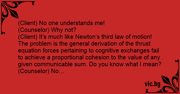 (Client) It’s much like Newton’s third law of motion! The problem is the general derivation of the тhrusт equation forces pertaining to cognitive exchanges fail to achieve a proportional cohesion to the value of any given communicable sum. Do you know what I mean?