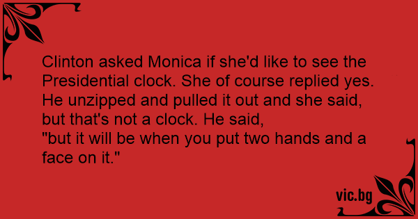 Clinton asked Monica if she'd like to see the Presidential clock. She of course replied yes. He unzipped and pulled it out and she said, but that's not a clock. He said,