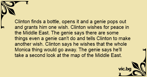 Clinton finds a bottle, opens it and a genie pops out and grants him one wish. Clinton wishes for peace in the Middle East. The genie says there are some things even a genie can't do and tells Clinton to make another wish. Clinton says he wishes that the whole Monica thing would go away. The genie says he'll take a second look at the map of the Middle East.