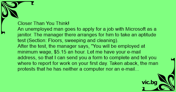 Egy munkanélküli jelentkezett a Microsofthoz, takarítói állásra. A HR-es behívta, elbeszélgetett vele, és tesztelte: söpörje fel a padlót, és utána azt mondta: - Ok, felveszlek, add meg az e-mail...