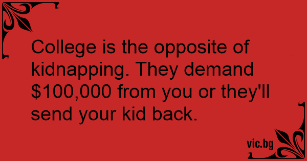 College is the opposite of kidnapping. They demand $100,000 from you or they'll send your kid back.