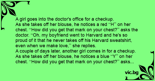 A couple of days later, another girl comes in for a checkup. As she takes off her blouse, he notices a blue Y on her chest. How did you get that mark on your chest? asks the doctor. Oh, my boyfriend goes to Yale and he's so proud of it that he never takes off his Yale sweatshirt, even when we make love, she replies.