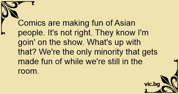 Comics are making fun of Asian people. It's not right. They know I'm goin' on the show. What's up with that? We're the only minority that gets made fun of while we're still in the room.