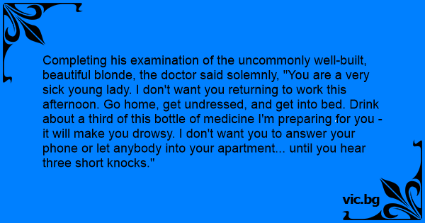 Completing his examination of the uncommonly well-built, beautiful blonde, the doctor said solemnly, "You are a very sick young lady. I don't want you returning to work this afternoon. Go home, get undressed, and get into bed. Drink about a third of this bottle of medicine I'm preparing for you - it will make you drowsy. I don't want you to answer your phone or let anybody into your apartment... until you hear three short knocks."