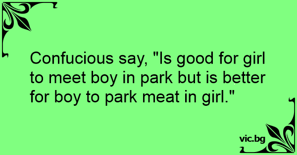 Confucious say, "Is good for girl to meet boy in park but is better for boy to park meat in girl."