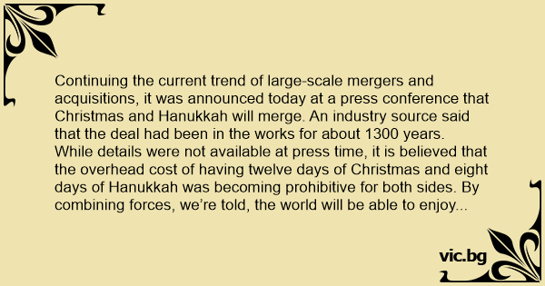 Continuing the current trend of large-scale mergers and acquisitions, it was announced today at a press conference that Christmas and Hanukkah will merge. An industry source said that the deal had been in the works for about 1300 years.
