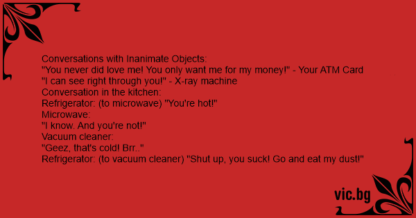 Refrigerator: (to vacuum cleaner) "Shut up, you suск! Go and eat my dust!"