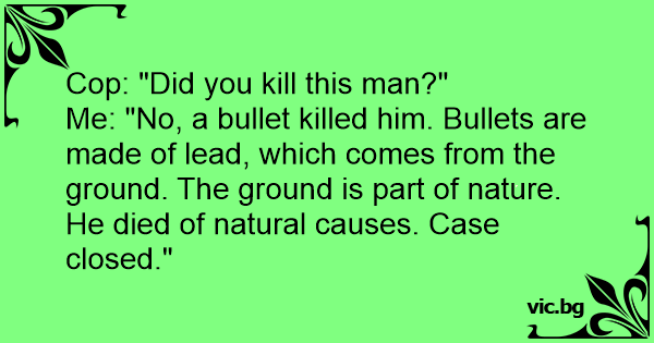 Me: "No, a bullet killed him. Bullets are made of lead, which comes from the ground. The ground is part of nature. He died of natural causes. Case closed."