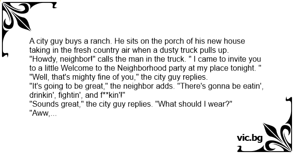 A city guy buys a ranch. He sits on the porch of his new house taking in the fresh country air when a dusty truck pulls up.