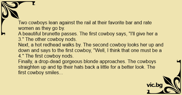 Finally, a drop-dead gorgeous blonde approaches. The cowboys straighten up and tip their hats back a little for a better look. The first cowboy smiles real wide and says, "Dамn! That one has GOT to be a 6." The second cowboy nods.