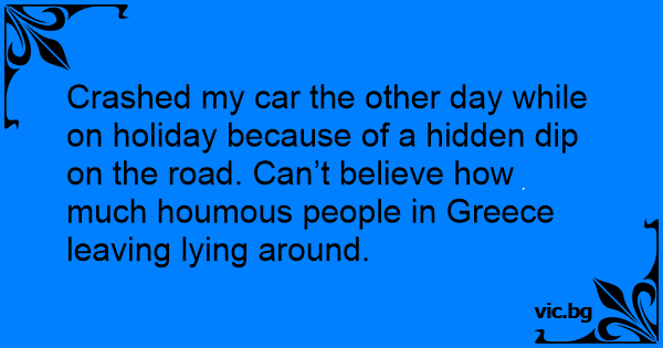 Crashed my car the other day while on holiday because of a hidden dip on the road. Can’t believe how much houmous people in Greece leaving lying around.