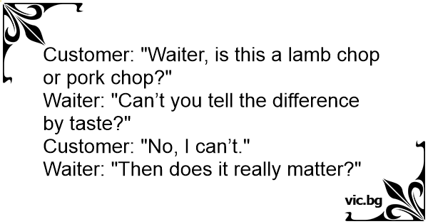 - Ospatar, acesta este cotlet de miel sau de porc? - Nu va puteti da seama dupa gust? - Nu. - Si atunci, mai conteaza?