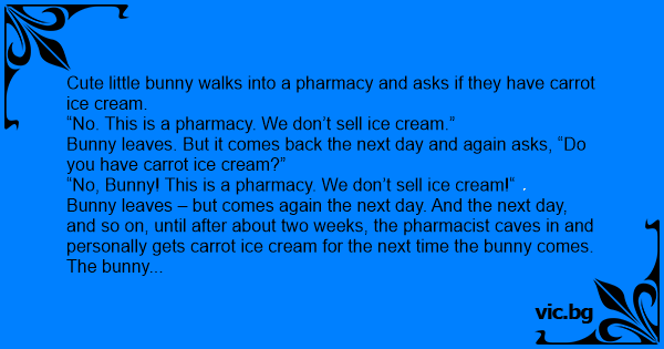Bunny leaves – but comes again the next day. And the next day, and so on, until after about two weeks, the pharmacist caves in and personally gets carrot ice cream for the next time the bunny comes.