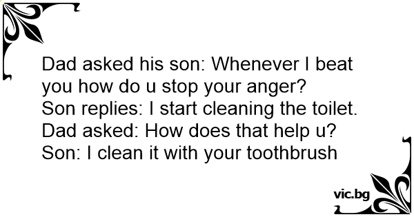 Dad asked his son: Whenever I beat you how do u stop your anger? Son replies: I start cleaning the toilet. Dad asked: How does that help u? Son: I clean it with your toothbrush
