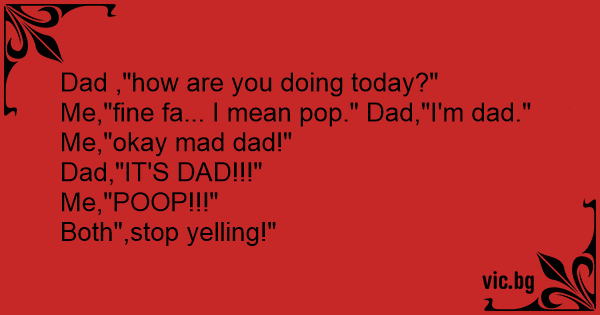 Dad ,"how are you doing today?" Me,"fine fa... I mean pop." Dad,"I'm dad."