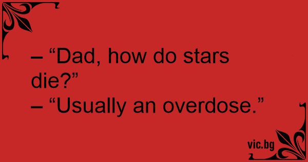 Баща и син на нощен риболов. Синът поглежда към нощното небе и пита баща си: - Тате, как умират звездите? - Обикновено от свръхдоза, синко.