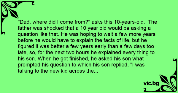 "Dad, where did I come from?" asks this 10-years-old. The father was shocked that a 10 year old would be asking a question like that. He was hoping to wait a few more years before he would have to explain the facts of life, but he figured it was better a few years early than a few days too late, so, for the next two hours he explained every thing to his son. When he got finished, he asked his son what prompted his question to which his son replied, "I was talking to the new kid across the street and he said he came from Ohio, so I was just wondering where I came from."