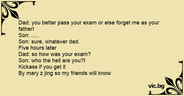Father: You better pass that exam or else forget that I'm your father. Son: Ok, dad. Next day Father: How was your exam? Son: Who are you?