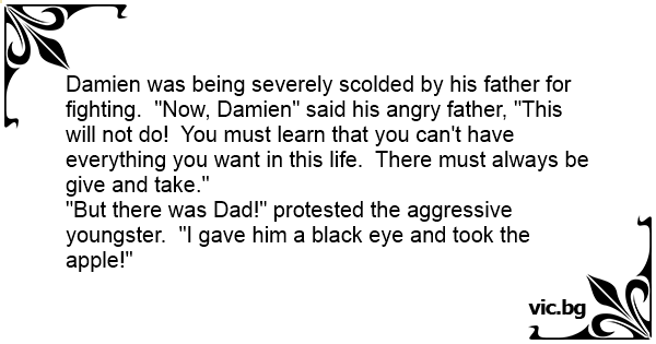 Damien was being severely scolded by his father for fighting. "Now, Damien" said his angry father, "This will not do! You must learn that you can't have everything you want in this life. There must always be give and take."