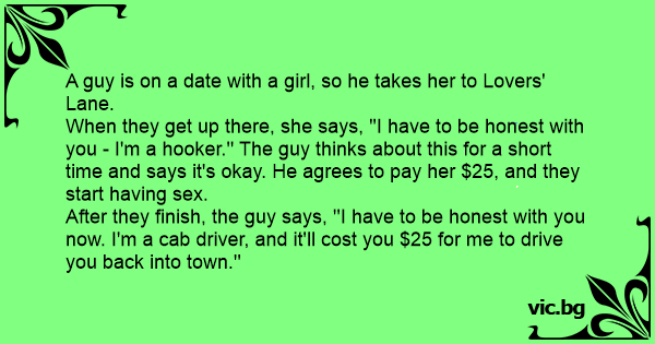 After they finish, the guy says, ''I have to be honest with you now. I'm a cab driver, and it'll cost you $25 for me to drive you back into town.''