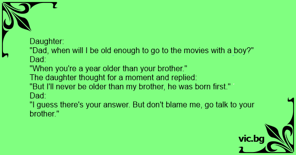 "Dad, when will I be old enough to go to the movies with a boy?"