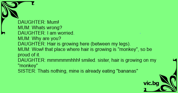 En jente var bekymret for at hun hadde fått hår mellom bena. Hun spurte moren om håret hennes. Moren hennes sa rolig: "Den delen hvor håret har vokst heter Monkey, vær stolt over at apen din har...
