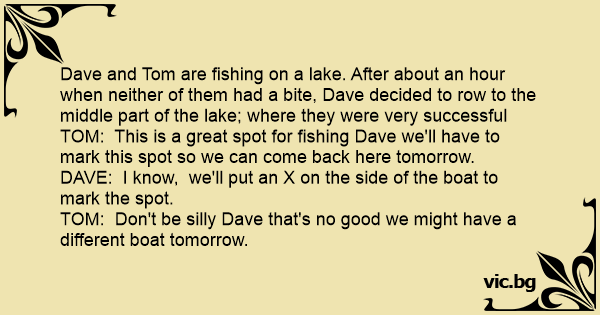 Dave and Tom are fishing on a lake. After about an hour when neither of them had a bite, Dave decided to row to the middle part of the lake; where they were very successful TOM: This is a great spot for fishing Dave we'll have to mark this spot so we can come back here tomorrow.