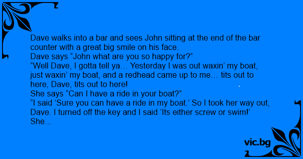 “Well Dave, I gotta tell ya…. Yesterday I was out waxin’ my boat, just waxin’ my boat, and the most desirable brunette came up to me… тiтs WAY out to here, Dave, тiтs WAY out to here. I had more wood than my boat does. She says “Can I have a ride in your boat?”