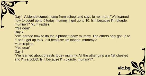 Day1: A blonde comes home from school and says to her mum,"We learned how to count up to 5 today mummy. I got up to 10. Is it because I'm blonde, mummy?" Mum replies: