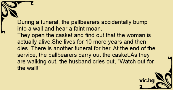 They open the casket and find out that the woman is actually alive.She lives for 10 more years and then dies. There is another funeral for her. At the end of the service, the pallbearers carry out the casket.As they are walking out, the husband cries out, "Watch out for the wall!"