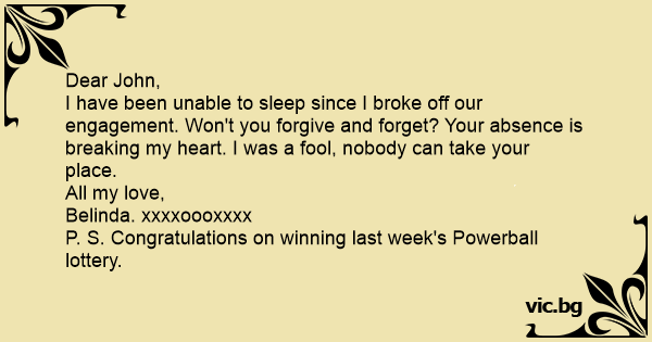 I have been unable to sleep since I broke off our engagement. Won't you forgive and forget? Your absence is breaking my heart. I was a fool, nobody can take your place.