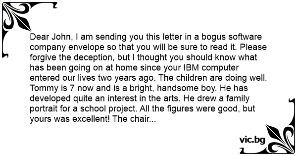 Dear John, I am sending you this letter in a bogus software company envelope so that you will be sure to read it. Please forgive the deception, but I thought you should know what has been going on at home since your IBM computer entered our lives two years ago. The children are doing well. Tommy is 7 now and is a bright, handsome boy. He has developed quite an interest in the arts. He drew a family portrait for a school project. All the figures were good, but yours was excellent! The chair and the back of your head are very realistic. You would be proud of him. Little Jennifer turned 3 in September. She looks a lot like you did at that age. She is an attractive child and quite smart. She still remembers that you spent the whole afternoon with us on her birthday. What a grand day for Jen, despite the fact that it was stormy and the electricity was out. I am also doing well. I went blonde about a year ago and was delighted to discover that it really is more fun. Lars--I mean Mr. Swenson, the department head, has taken an interest in my career and has become a good friend to us all. I have discovered that the household chores are much easier since I realized that you don't mind being vacuumed around, although that feather duster does make you sneeze. The house is in good shape. I had the living room painted last spring. I'm not sure if you noticed it. I made sure that the painters cut air holes in the drop cloth so you wouldn't smother. Well, dear, I must be going. Uncle Lars - Mr. Swenson, I mean, is taking us all on a ski trip and there is packing to do. I have hired a housekeeper to take care of thing while we are away. She'll keep things in order, fill your coffee cup, and bring your meals to your desk, -just the way you like it. I hope you and IBM have a lovely time while we are gone. Tommy, Jen and I think of you often - try to remember us while your disks are booting. Love, Angela.