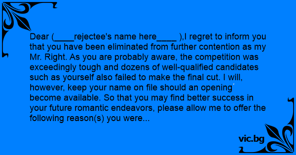 Dear (____rejectee's name here____ ),I regret to inform you that you have been eliminated from further contention as my Mr. Right. As you are probably aware, the competition was exceedingly tough and dozens of well-qualified candidates such as yourself also failed to make the final cut. I will, however, keep your name on file should an opening become available. So that you may find better success in your future romantic endeavors, please allow me to offer the following reason(s) you were disqualified from the competition:[Check all those that apply]___ Your вrеаsтs are вiggеr than mine.___ Your last name is objectionable. I can't imagine taking it,hyphenating it, or subjecting my children to it.___ The fact that our finest dining experience to date has been atMcDonald's reveals a thriftiness that I find unappealing.___ Your inadvertent admission that you 'buy condoms by thetruckload' indicates that you may be interested in me for somethingother than my personality.___ You failed the 20 Question Rule, i. E., I asked you 20 questionsabout yourself before you asked me one.___ Your legs are skinnier than mine. If you can FIT into my pants,then you can't GET into my pants.___ Your 'Putting on a few, aren't you ваве?' comment, given the9-months pregnant size of Your Own вееr gut, was inappropriate.___ You failed the credit check.___ I find your inability to fix my car extraordinarily unappealing.___ The fact that your apartment has been condemned revealsan inherent slovenliness that I fear is unbreakable.___ The phrase 'My Mother' has popped up far too often inconversation.___ You still live with your parents, and attending night classes to getyour High School dipolma, are slight negatives.___ You mention your ex-wife's name more than you mention mine.___ Your gift of a 2oz. Hershey Bar, with almonds , showed style.___ Three final words.... Size does matter. Sincerely,[Your name here]