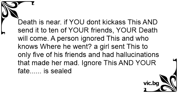 Death is near. if YOU dont kickass This AND send it to ten of YOUR friends, YOUR Death will come. A person ignored This and who knows Where he went? a girl sent This to only five of his friends and had hallucinations that made her mad. Ignore This AND YOUR fate...... is sealed