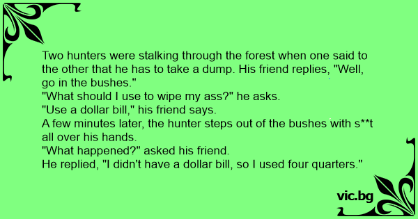 Two hunters were stalking through the forest when one said to the other that he has to take a dump. His friend replies, "Well, go in the bushes."