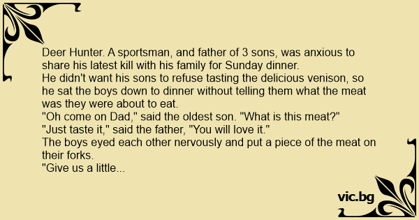 He didn't want his sons to refuse tasting the delicious venison, so he sat the boys down to dinner without telling them what the meat was they were about to eat.