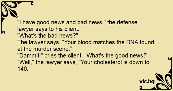 "I have good news and bad news," a defense attorney told his client. "First the bad news: The blood test came back, and your DNA is an exact match with the sample found on the victim's dress." "Oh, no - I'm ruined!" cried the client. "What's the good news?" "Your cholesterol is down to 140!"